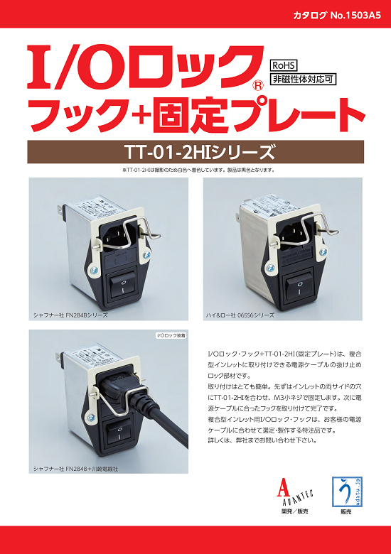 《特注品》ON/OFFスイッチ等が組み込まれた「複合型インレット」に取り付けできるI/Oロック。固定プレートとフックのセットです。